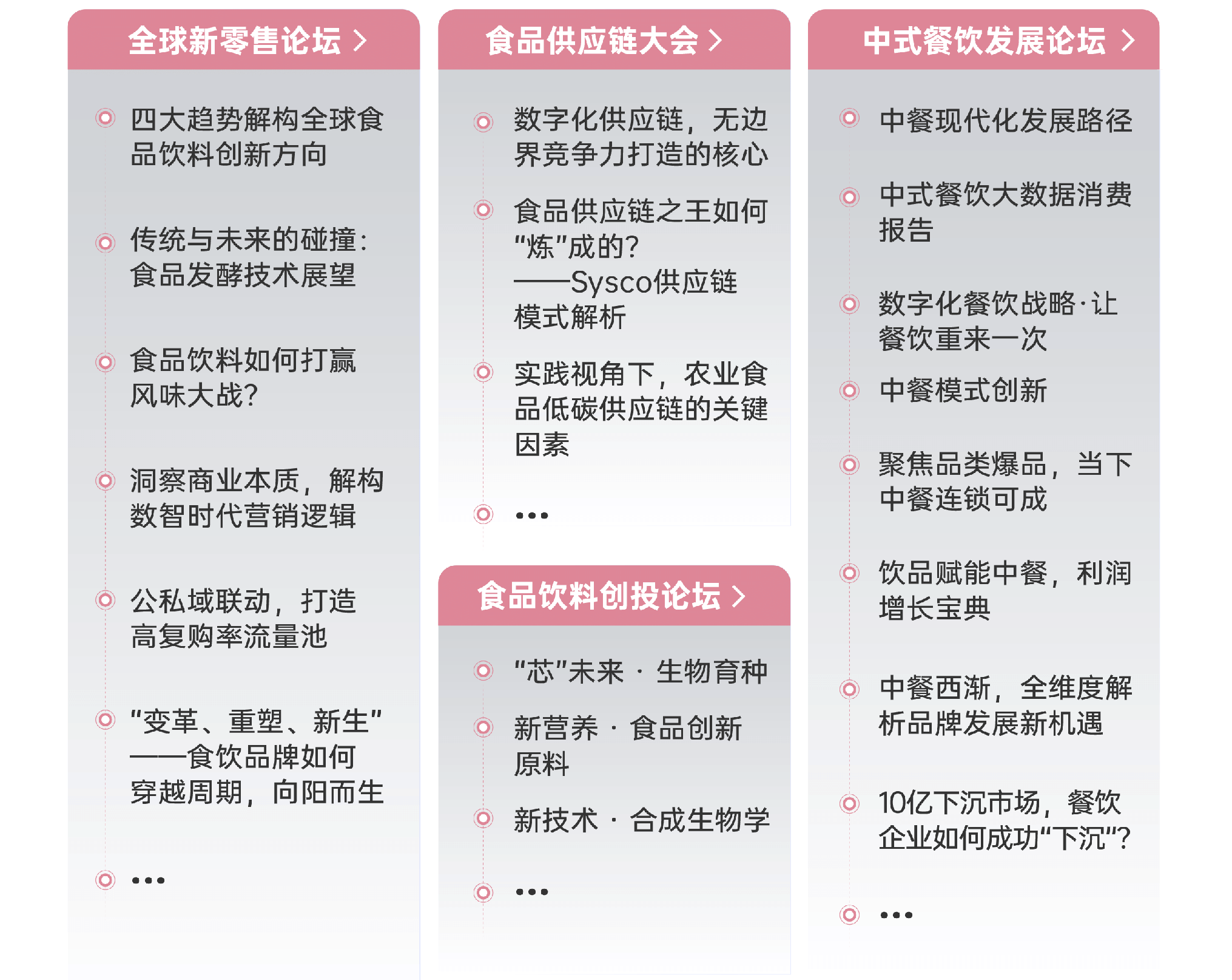 | 作為SIAL世界三大食品展之一,SIAL西雅展(上海)2023年規模預計將達到18萬平方米、4,500+全球展商、12大主題館、14個熱點專區、30萬件展品,同期舉辦的第四屆SIAL世界食品產業峰會以“經緯世界,擁抱變革”為主題,聚焦新零售、供應鏈、肉類、飲品、食品科技、進口食品、食品投融資、中餐等食飲行業熱門話題,9大主題論壇早鳥票火熱搶購中! |